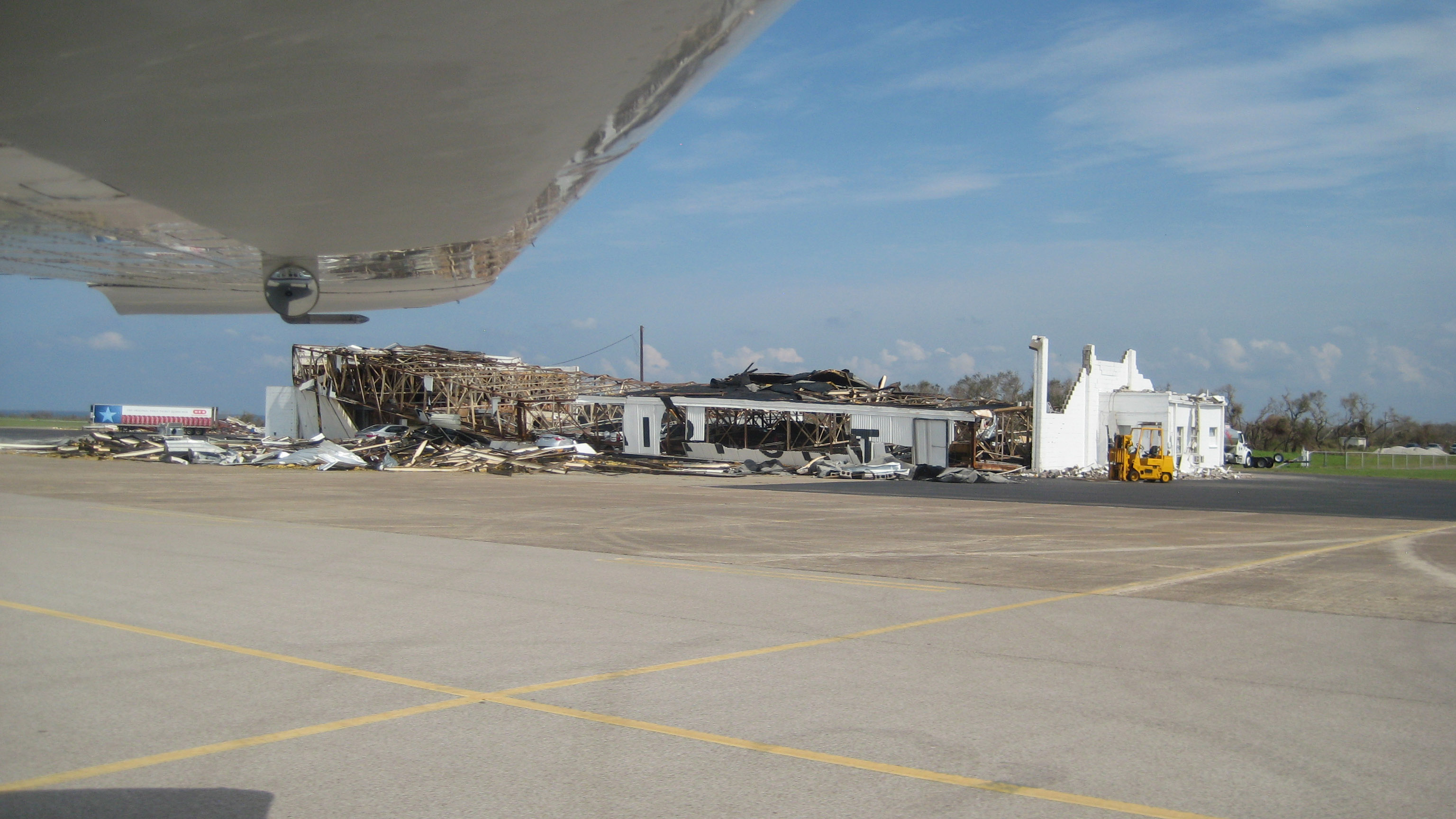 While on final approach to Runway 14 at Rockport, I expected to see areas under water, but there weren’t any. Aimpoint-airspeed focused my attention on the runway for a normal landing, but once I slowed down and started looking for my turnoff, I was caught off guard by a pile of twisted metal in the infield next to the runway. Pile after pile of twisted metal—the remains of hangars that had been blown to pieces—dotted the airfield, raked into piles like you would rake the leaves in your yard.