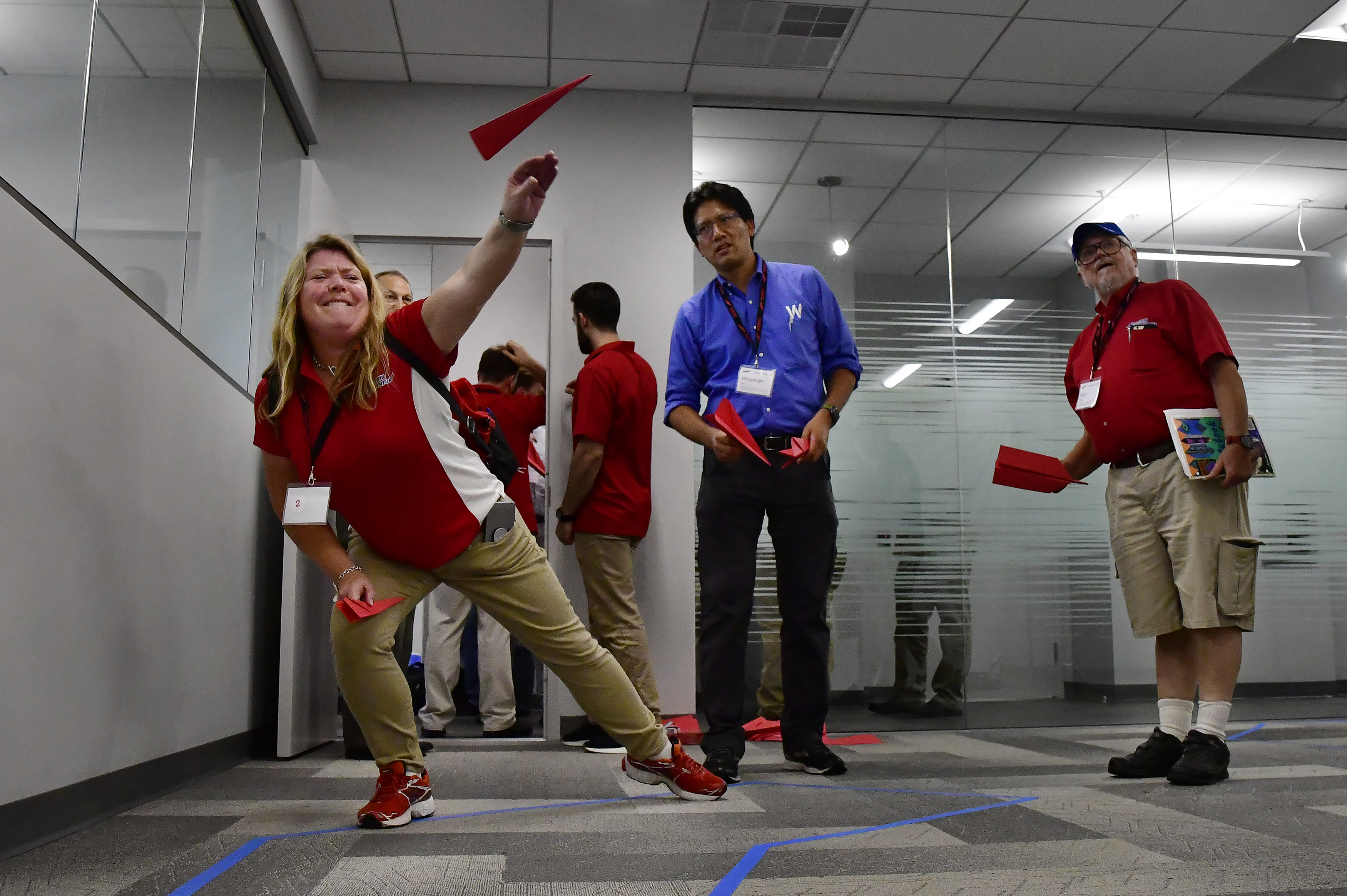 A signature event was the Redbird Challenge aviation triathlon in which teams competed in an airplane and airport trivia quiz, a paper airplane golf tournament, and a “blind landing.” Conference rooms and hallways at the AOPA You Can Fly Academy were packed with enthusiastic instructors as they strategized for superiority while red paper airplanes flew toward the “pins” nearby.