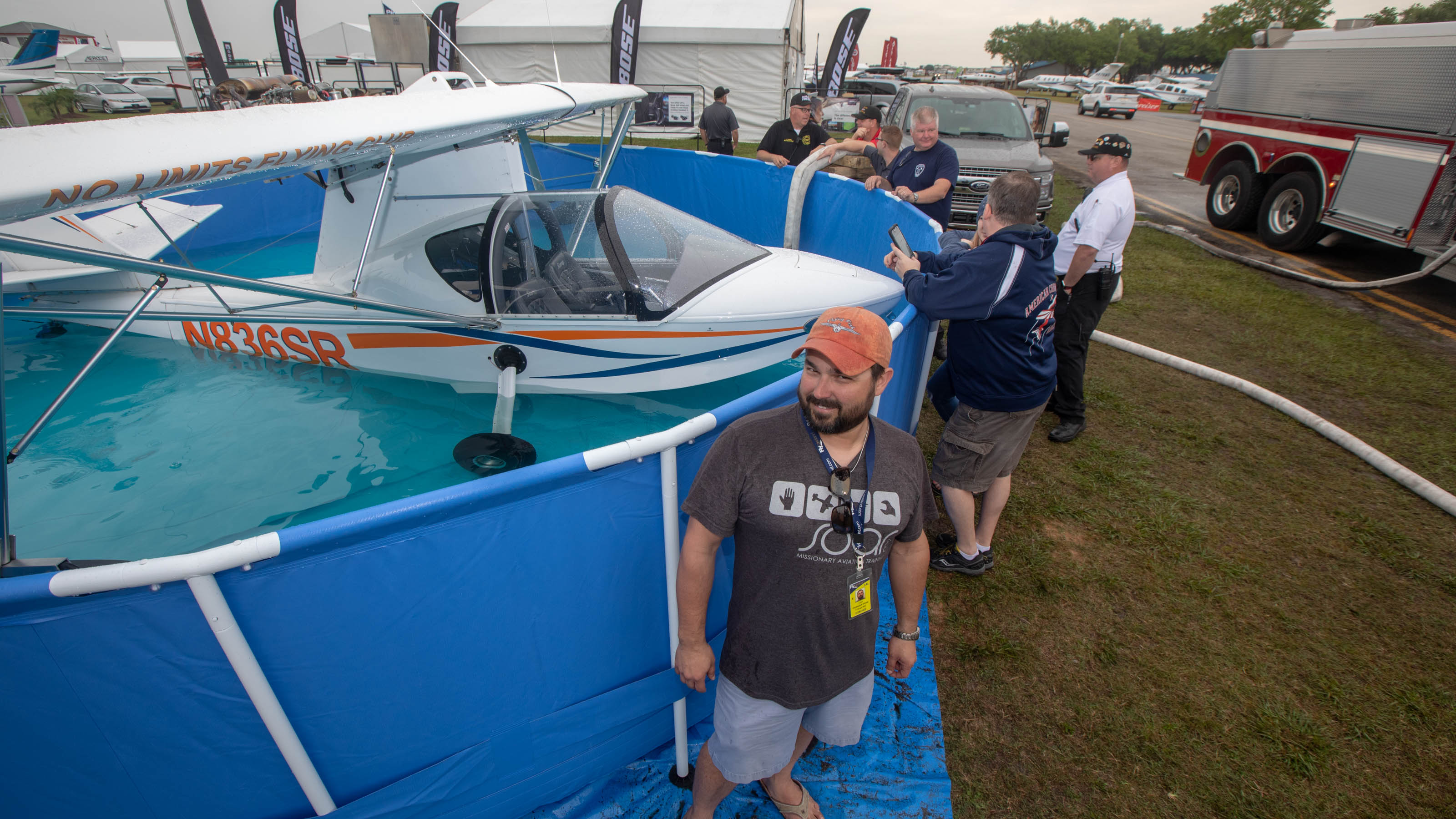 Chris Hinote, the owner of Flying Fish, was optimistic that a swimming pool he set up to display one of his company’s Progressive Aerodyne SeaRey amphibians would not turn into a small flood as local firefighters filled it with a small parade of tanker trucks on April 1.