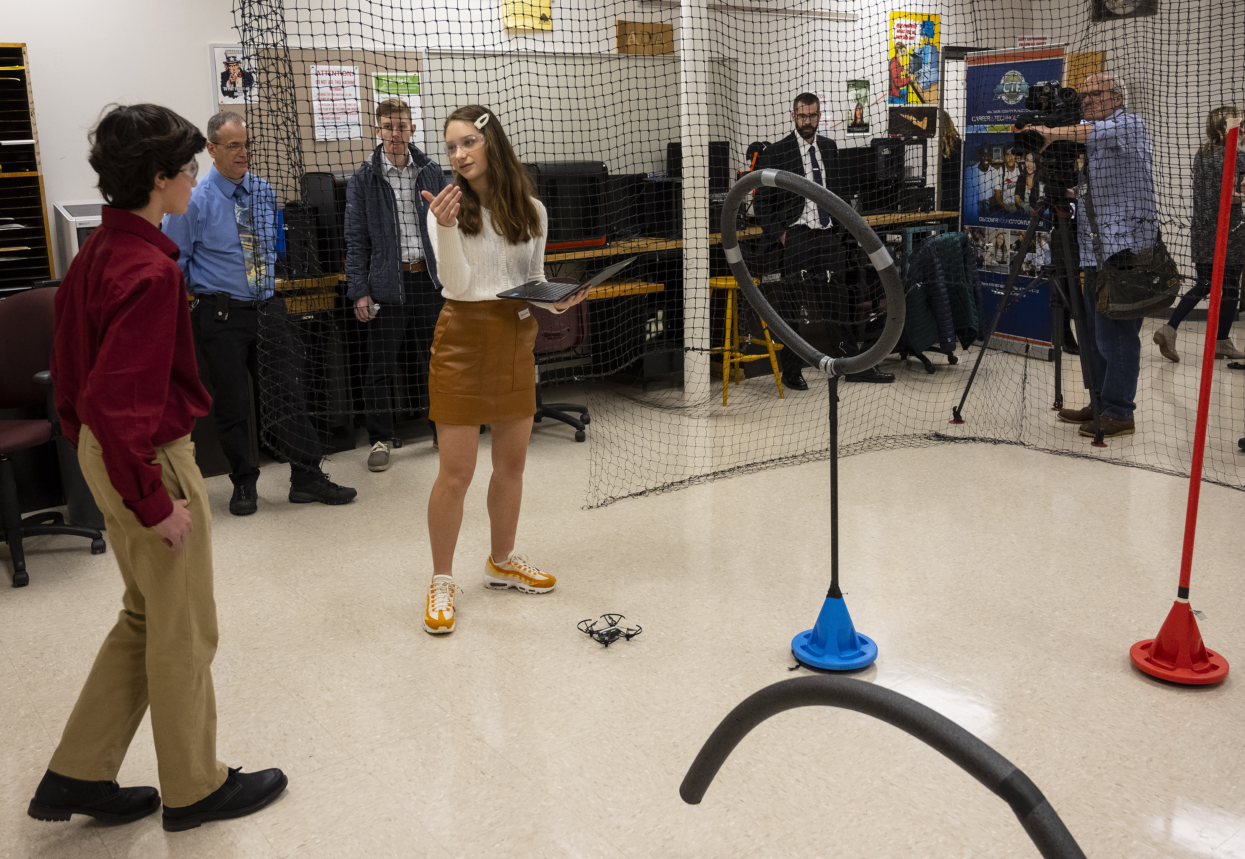 Drones flew through the air and guests took turns piloting a flight simulator during the opening of an aviation technology program at Hereford High School near Baltimore, Maryland, powered by the AOPA High School Aviation STEM Curriculum for youth.