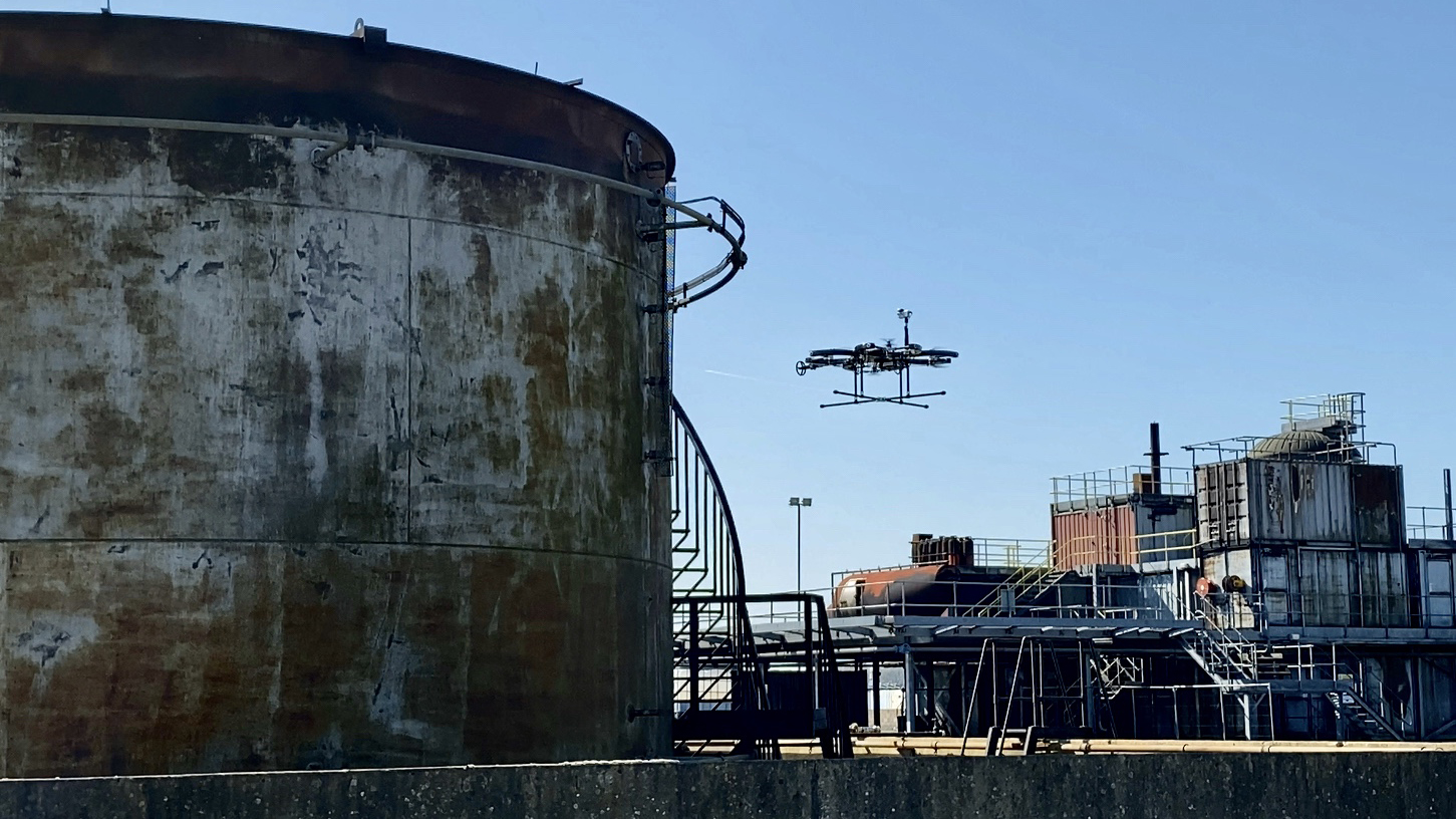 Skygauge Robotics Founder and CEO Nikita Iliushkin said in a video chat that the most commonly used small drones on the market have a key shortcoming when it comes to high-precision positioning: a rigid airframe. The fixed-pitch propellers attached to the motor arms must speed up or slow down in pairs, tilting the entire aircraft. While mechanically simple, this fundamental design shared by nearly every quadcopter creates a lag in response time, and that can pose serious issues if the aircraft is to take precise measurements using sensitive instruments that must make firm contact with the material being inspected.