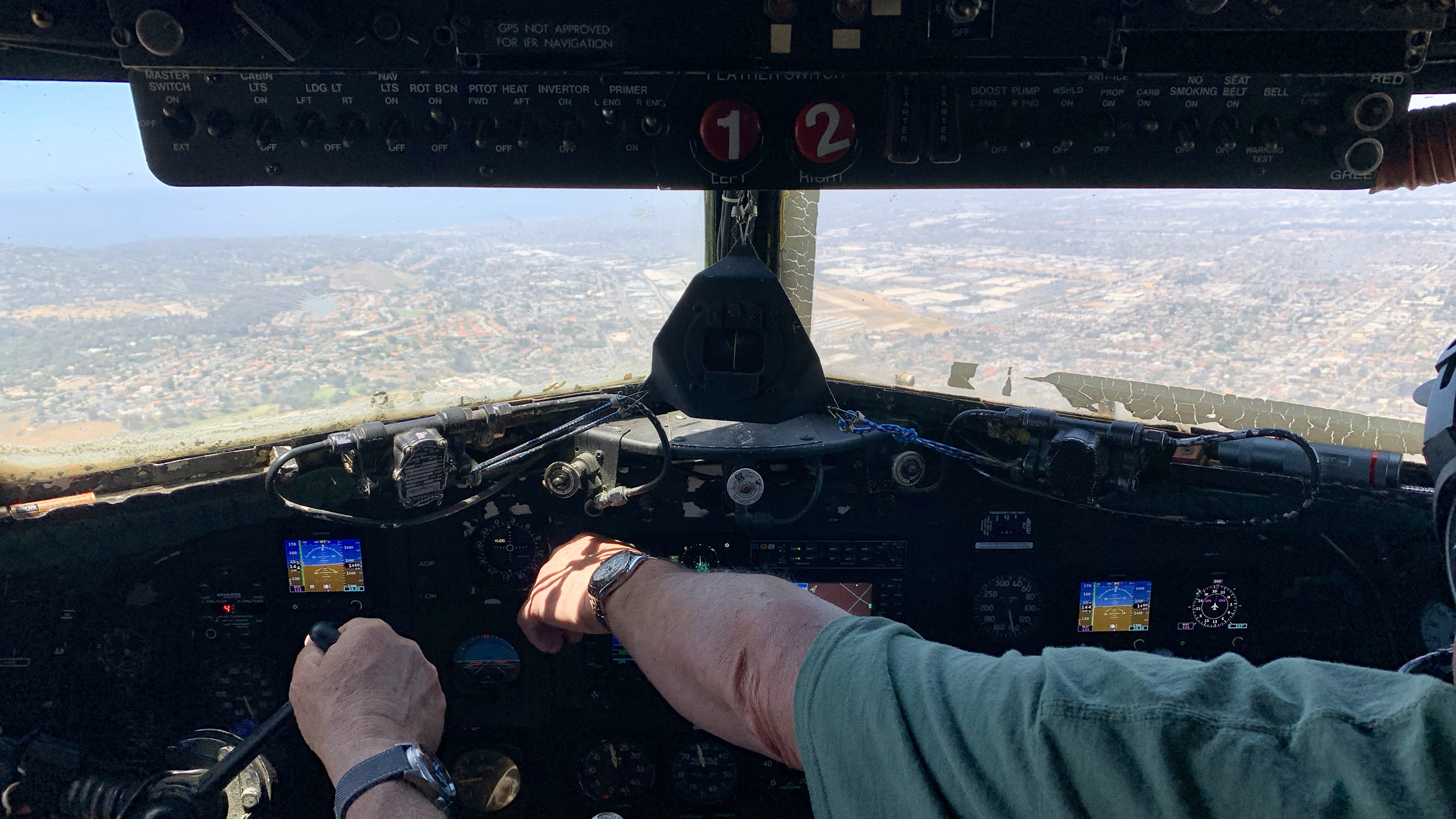 Aboard Betsy’s Biscuit Bomber, which is still outfitted as a jump airplane, the atmosphere was electric. Whether watching the Condor Squadron’s T–6s form up around the C–47s and C–53s, gazing down at jacaranda-lined avenues, or even getting a glimpse of the Virgin Orbit rocket launch attempt, everyone’s eyes were glued outside in awe. Dustin Mosher, a general aviation pilot who works on the Paso Robles-based C–47 “a handful of Saturdays a year,” rode along for the flyover. “It’s an honoring experience given the times we’re in,” he said. “The DC–3 is a true symbol of survival.”