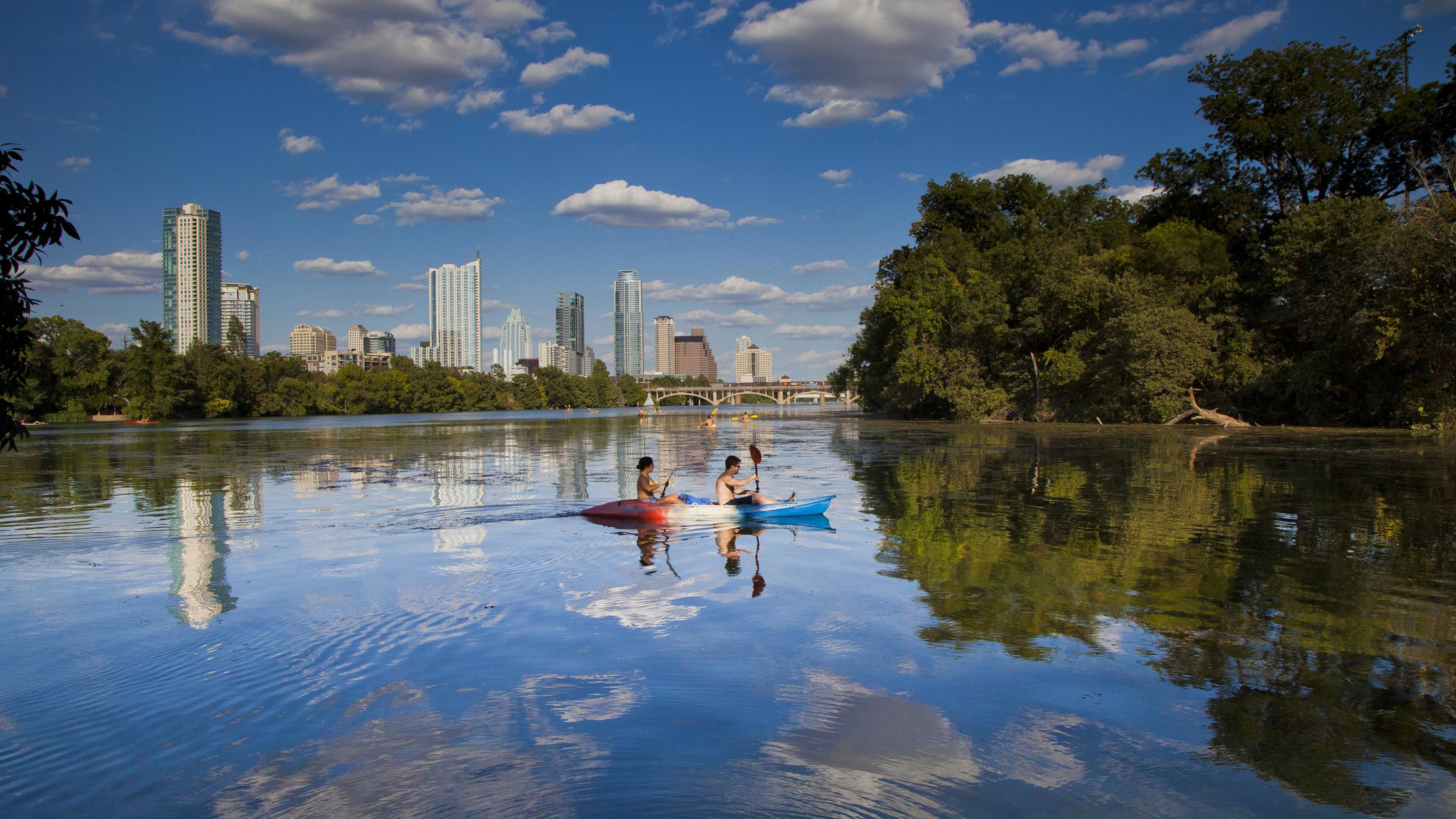 The boardwalk, including a series of bridges directly over the water on the trail’s south side, connects the east and west halves of the trail. As we traveled the loop, we passed some of Austin’s famous landmarks, from the memorial statue for blues guitarist Stevie Ray Vaughan, who was an Austin resident when he died in 1990, to Barton Springs Pool, a three-acre, 68-degree spring-fed pool inside the 351-acre Zilker Metropolitan Park, which was preparing to host the two-weekend Austin City Limits Music Festival.