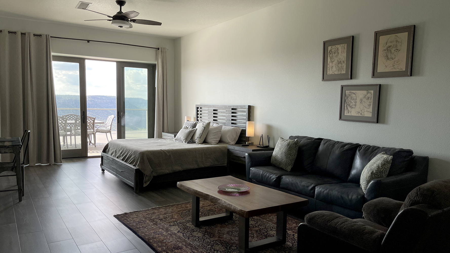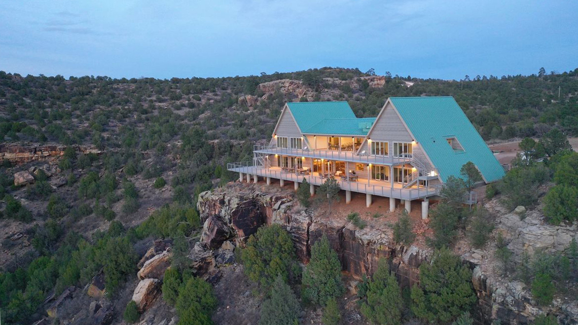 There are eight suites with king-size beds spread out across a pair of two-story structures, and the buildings are connected via bi-level great rooms and massive metal-alloy decks cantilevered about 700 feet above Canadian River Canyon, The top level has an open-air game room; the ground level great room has an enclosed dining and lounge area alongside a commercial kitchen.