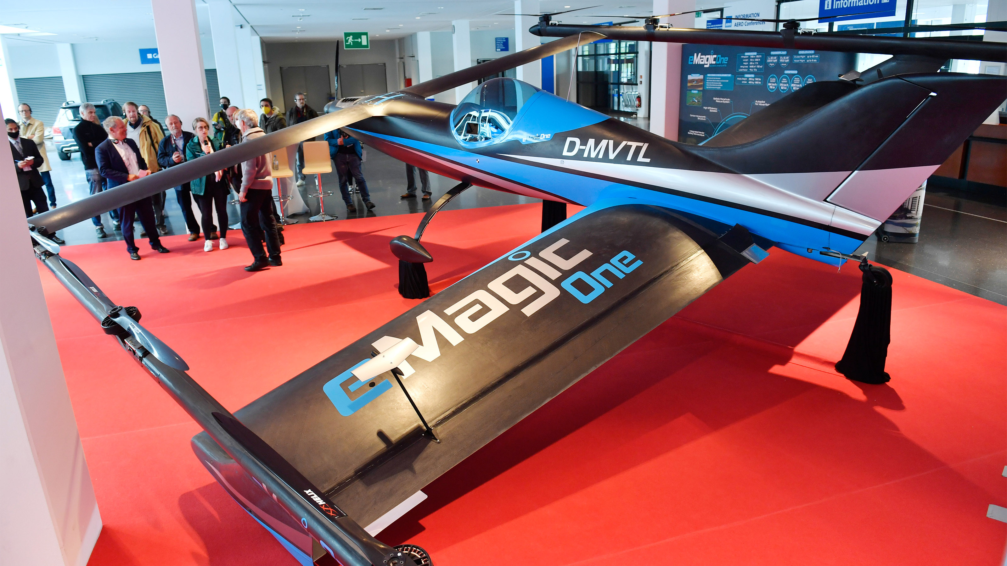 This eVTOL is a German design in the proof-of-concept stage. It has one nose-mounted conventional propeller for cruise flight and eight boom-mounted props for hovering flight. First flight of the single-seater was in May 2021, and the company advertises a two-hour endurance on a four-hour charge of its front propeller battery and two-hour charges of its hover-motor batteries. The eMagic One has a forward canard wing, and a rear, main wing with elevons (having combined full-span elevator and aileron functions) for pitch and roll control. Like a helicopter, the aircraft uses collective lift controls for takeoffs, landings, and other vertical maneuvers. A two-seater is in the works, and the company believes that the American market holds the most promise in terms of sales, either in the experimental or special light sport aircraft markets.