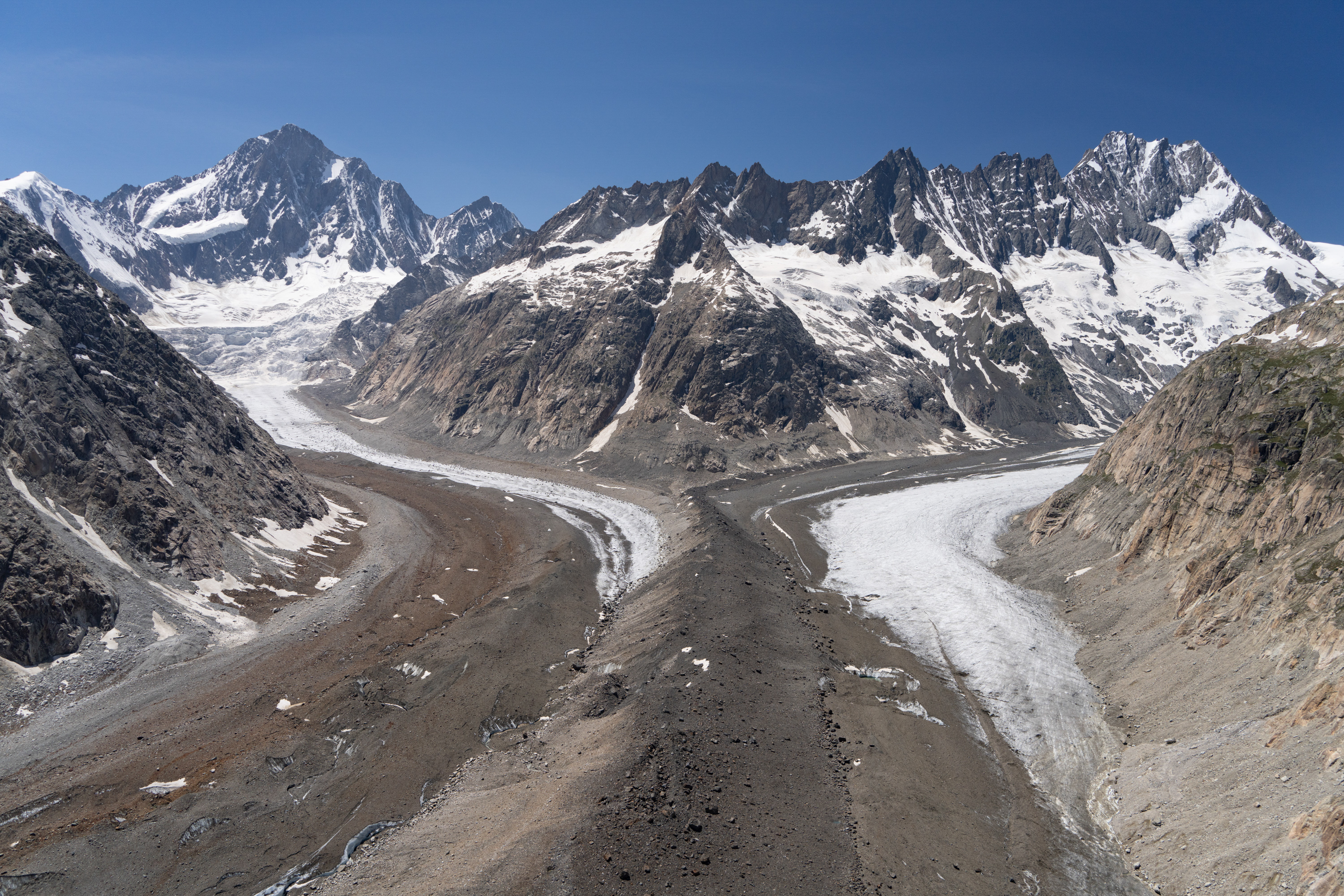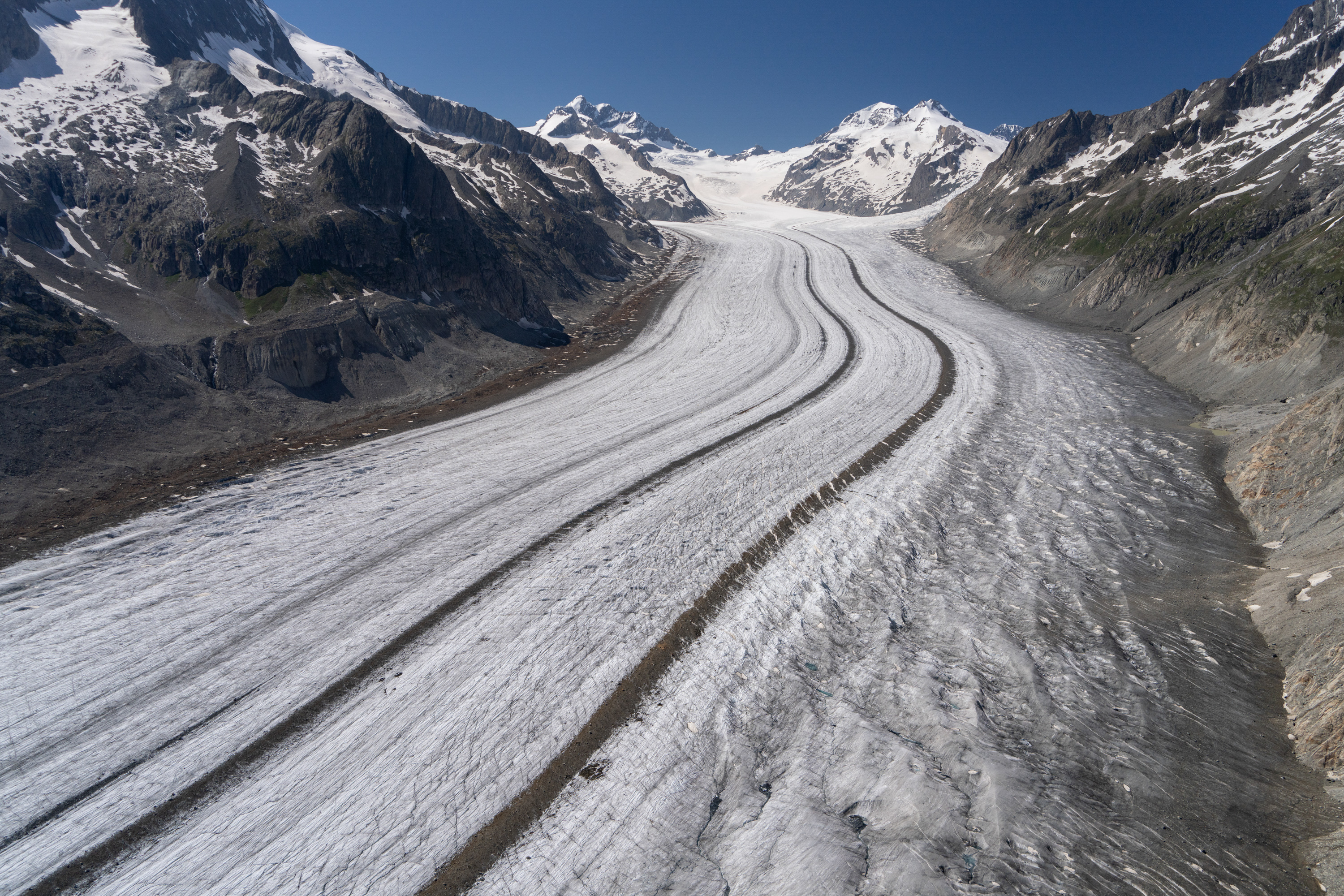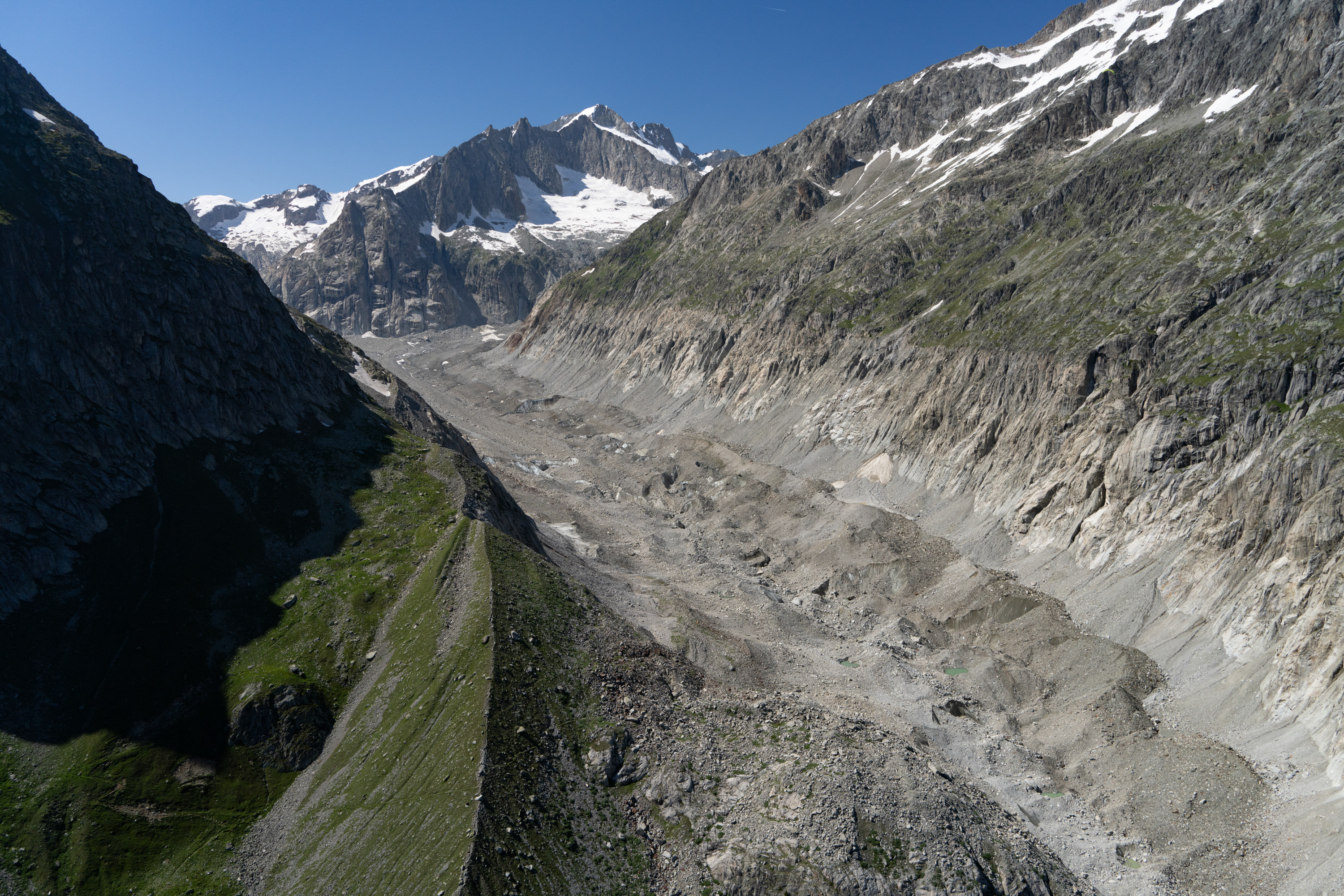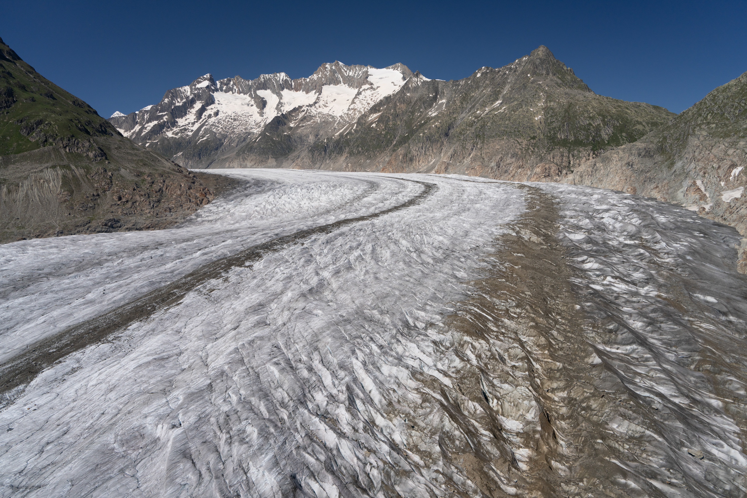 The next task was the tongue of the Aletschgletscher, the longest in the Alps. The light was once again good, so my goal was to repeat the day’s theme, which was intimate views of the terminus of the glacier. The Aletschgletscher appears rather flat, owing to its length. As I proceeded up the glacier, I had a sensation that I was descending, which proved to be an illusion. Altitude was stable, though subtle increases in glacier elevation were tricking my depth perception. A few minutes later, when I had flown about a mile further up the glacier, I had the same sinking feeling, which I thought was a perception issue again, only to realize when checking the altimeter that there were downdrafts. As I was running out of vertical space, battling wind and a downdraft with possibly a katabatic and thermal component to it, I executed a 180-degree turn and preemptively added full power. There was no sense lingering.