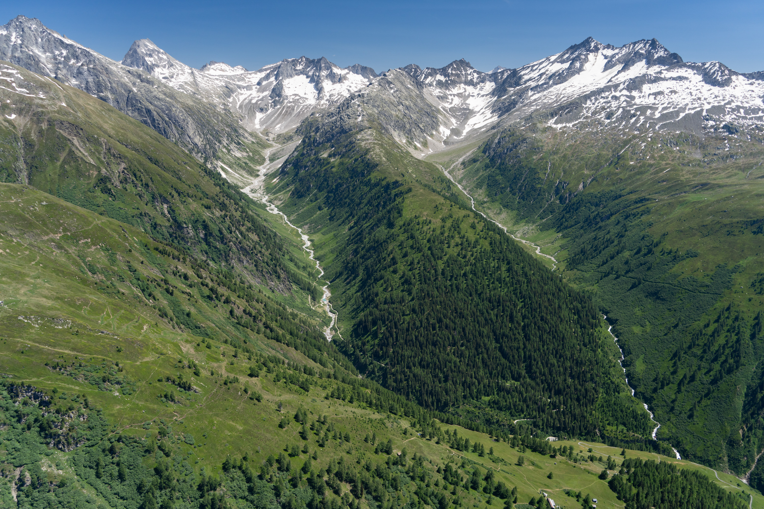 The flight next went up to the headwaters of the Urbachtal, requiring a bit of climbing. There is a glorious lake that sits in a valley with at least seven glaciers feeding into it, one of which is the Gauli gletscher. Like the Rosenlaui gletscher, I had never looked up at it from the level of the tongue; I had only looked down in times past. I was again reminded how little space there is down at these lower levels. What appeared to be spacious ended up to be a brief foray in and then out of a tight box canyon.