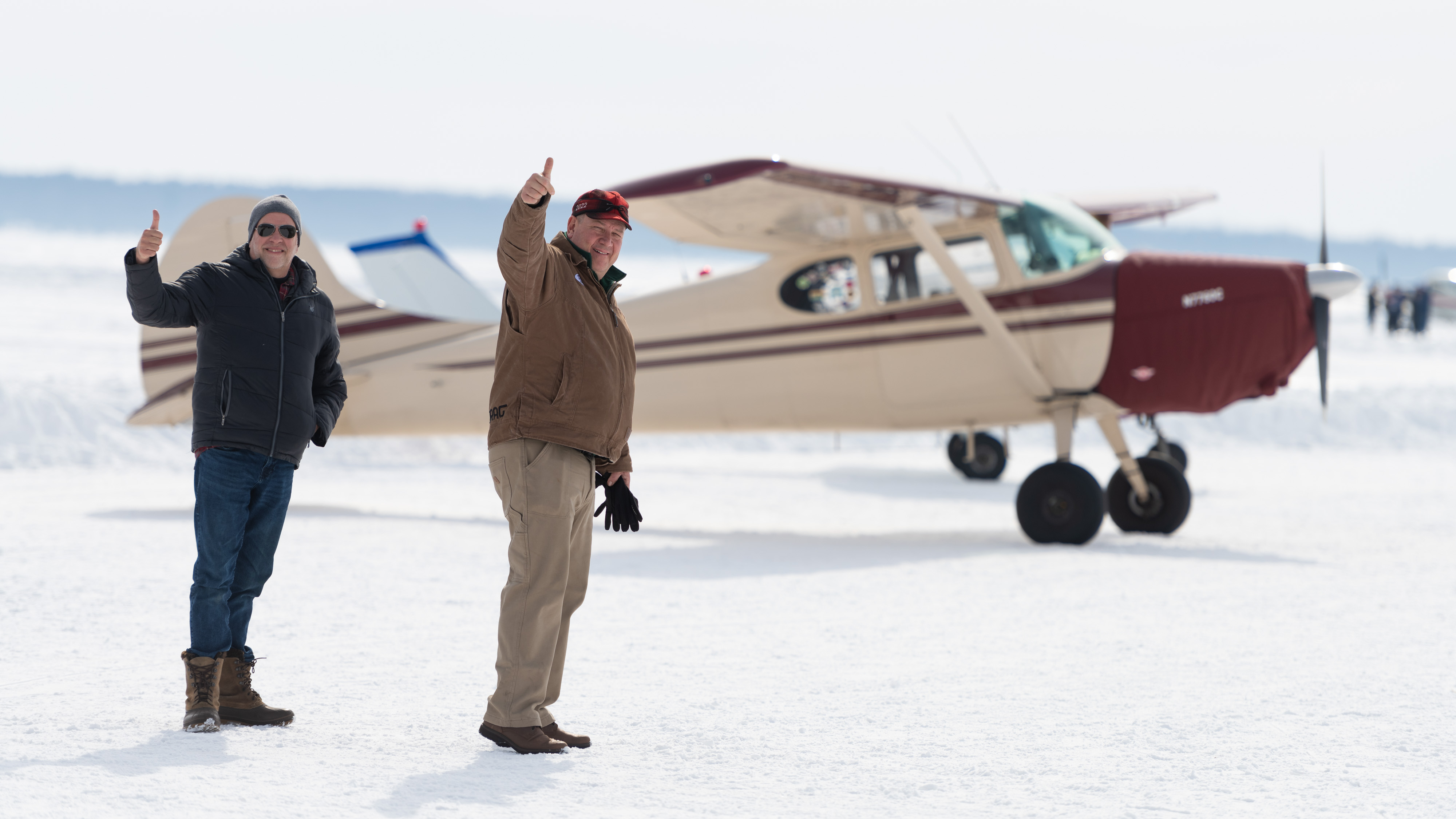 “I used to plow a runway just outside my folks’ house on the north side of the lake to visit Mom and Dad and play cards, and I was on wheels. And that is when I decided to share that experience with other pilots; everybody should be able to land safely on a frozen lake on wheels. And doing it in a safe environment, as you can see, the volunteers plowed a great runway (approximately a mile long by 100 feet wide). So basically, you don’t need brakes at all, and we recommend not using them.”