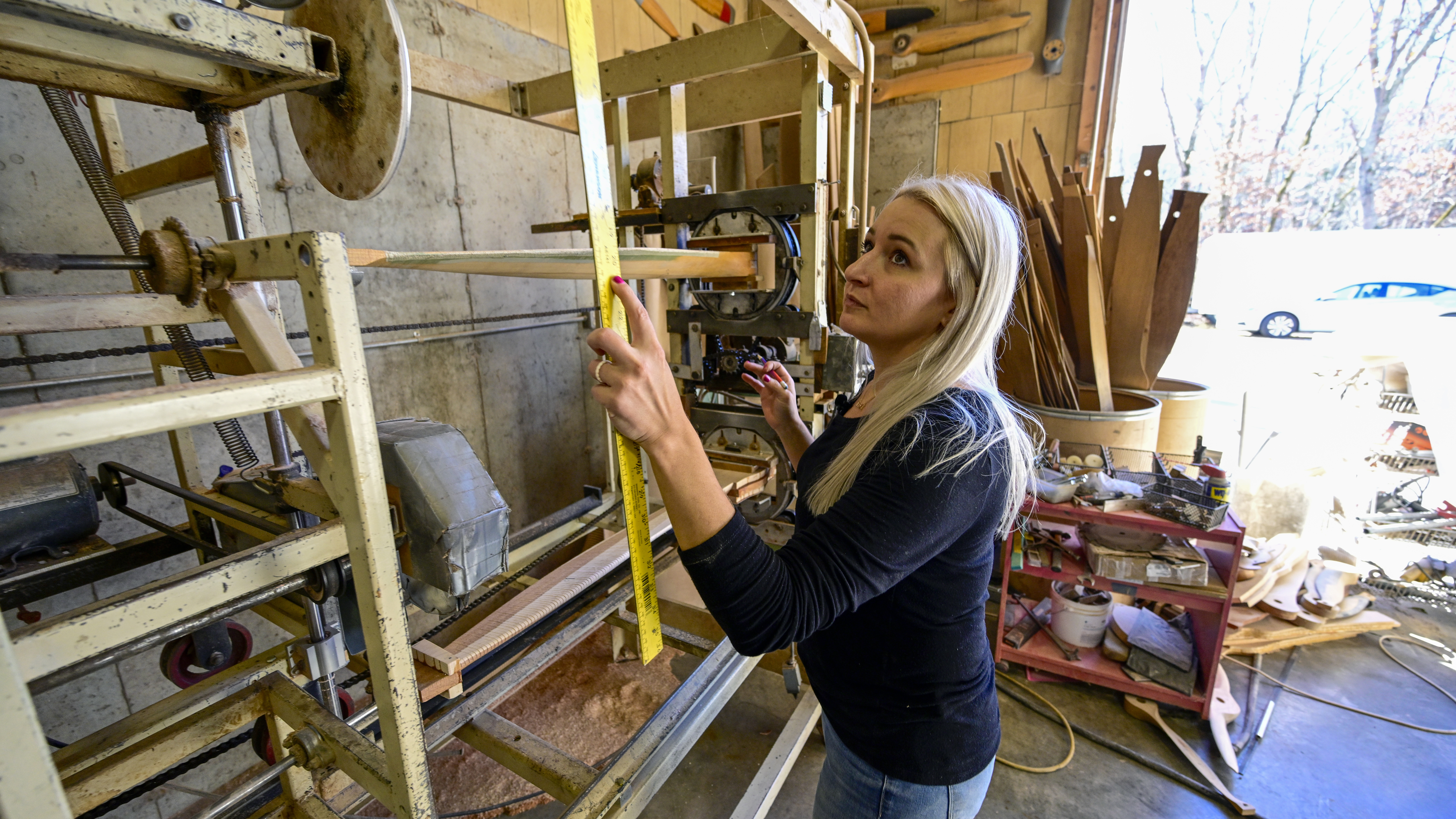 The process starts with perfect pieces of wood, shipped from Kansas City on an 18-wheeler too big to navigate the county road, let alone the farm lane (the wood is offloaded to Lewis’s truck at a gas station on the interstate). Lewis uses primarily hard white maple, which she says is incredibly strong and not as heavy as oak or walnut. Some of the propellers-to-be are mahogany, which is also strong and has the added benefit of providing an authentic look for World War I replica aircraft. Maple and mahogany have a tight grain that stands up to the torque forces of a full-power takeoff.