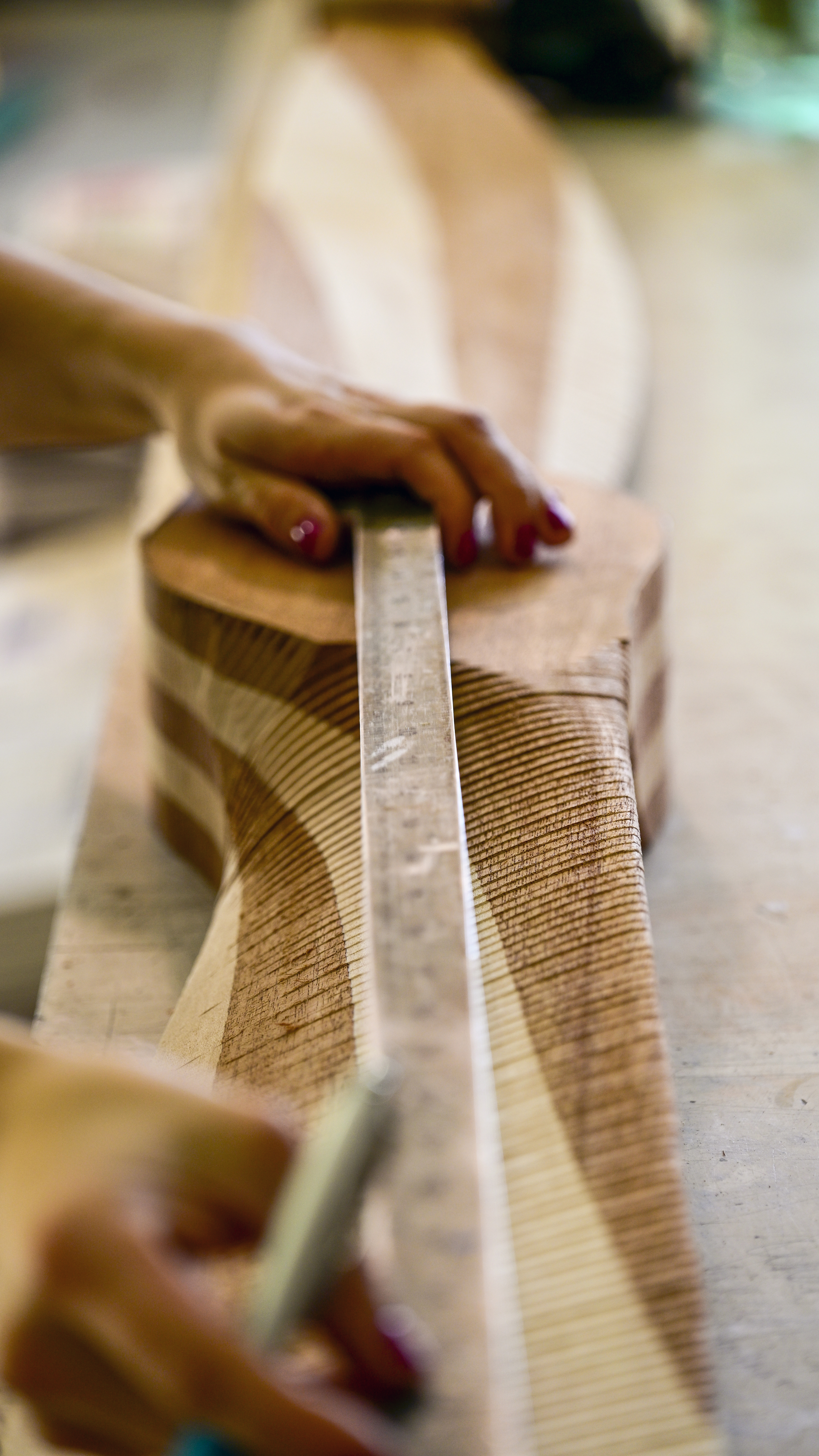 Lewis inspects each piece of wood, looking for defects such as cracks, knots, or unsightly grains, or a dense spot in the wood that would likely throw its balance off. She selects a pattern that will be used to cut out as many layers of the wood as the propeller requires.