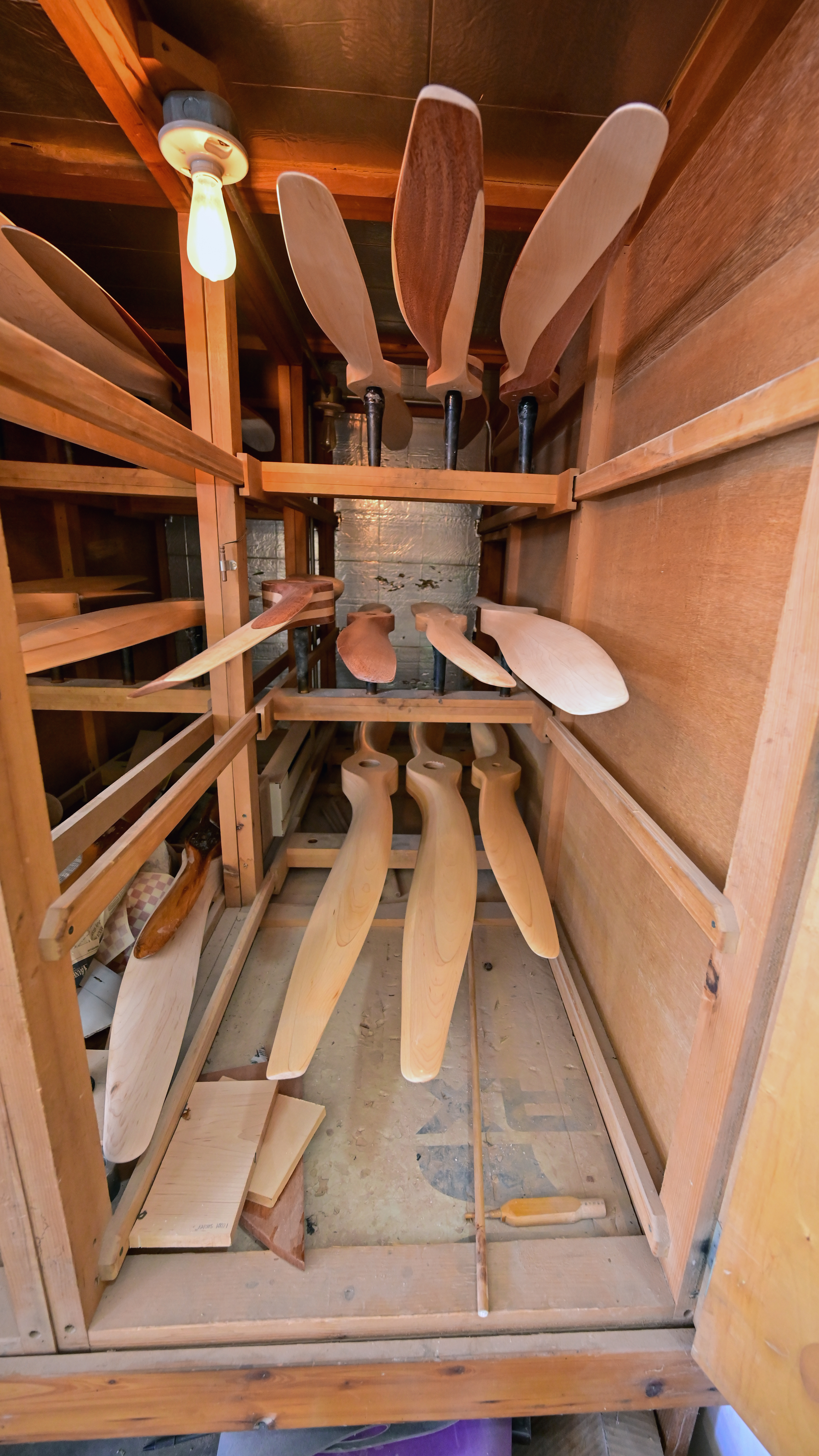 Each propeller is created via patterns, traditions, and equipment refined and handed down over decades.The rich aroma of mahogany will hit you before you spy the woodstove; racks of propeller patterns; stacks of wood; and orders in various stages of completion. One of these is a propeller that belonged to John K. Moody, known as the father of ultralight aviation and the first person to develop a powered hang glider that could be launched from flat terrain, without benefit of wind. When this propeller is rehabilitated, it will grace an Easy Riser—the same type of swept-wing biplane hang glider that Moody looped at an Experimental Aircraft Association airshow in the 1980s.