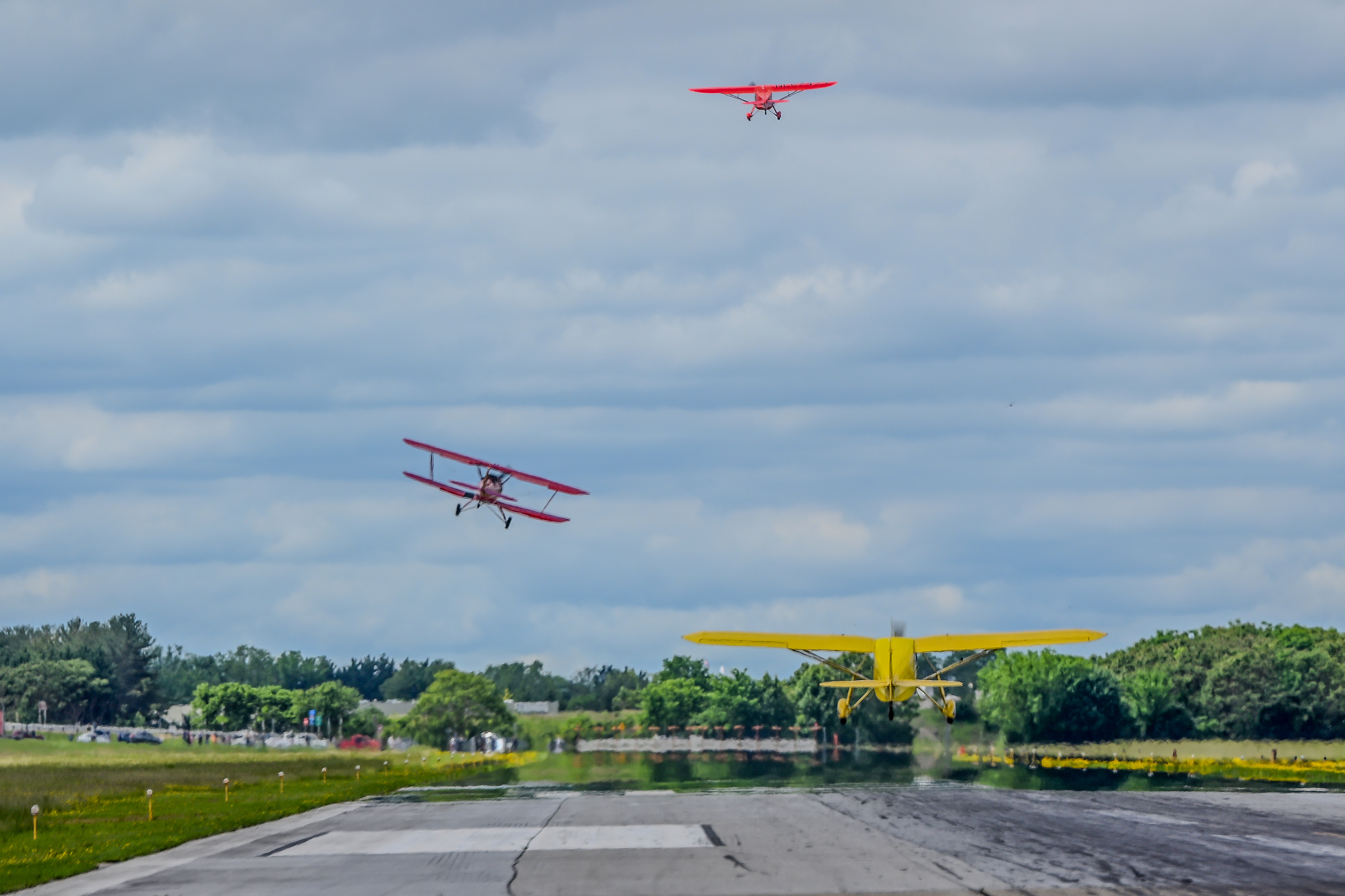 The line of aircraft was led by AOPA President Mark Baker in his Beechcraft Model 17 Staggerwing. He led the first of the 15 chapters with the call sign “Golden One.” Boggs told him: “Cleared for takeoff at your assigned time.” Baker lifted off Runway 23 at exactly 11:38 a.m., followed by aircraft representing their chapters in aviation history with call signs such as “Boom,” “Trainer,” “Rotor,” “Bush,” “Built;” “Sport,” “Growth,” “Airshow,” and “Safety.” Aircraft chapters were spaced minutes apart based on their assigned airspeeds.