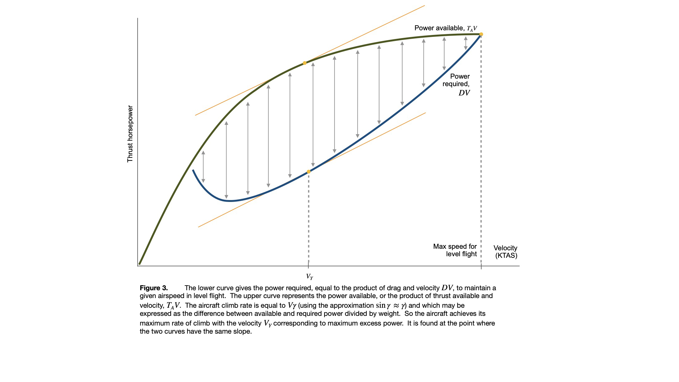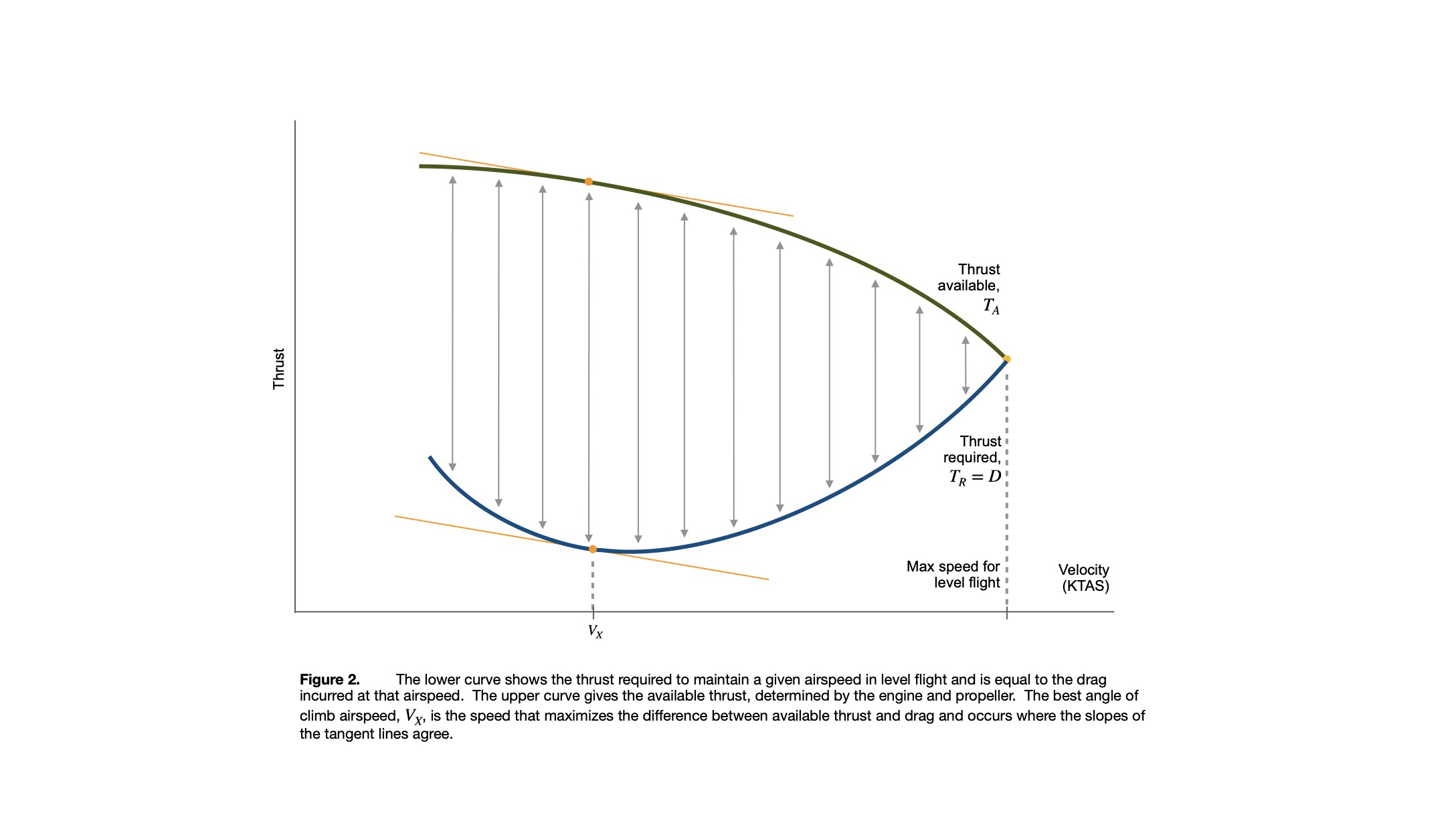The sidebar figures explain how the best angle of climb airspeed VX and the best rate of climb airspeed VY are defined and determined in flight tests. Best angle of climb VX occurs at the airspeed that maximizes excess thrust. (See Figures 1 and 2, below.) Best rate of climb VY is found at the airspeed that maximizes excess power. (See Figure 3, below.) During certification, test pilots fly the aircraft at maximum power and record the vertical speed across a wide range of airspeeds to produce the curve in Figure 4, from which both VX and VY can be determined.