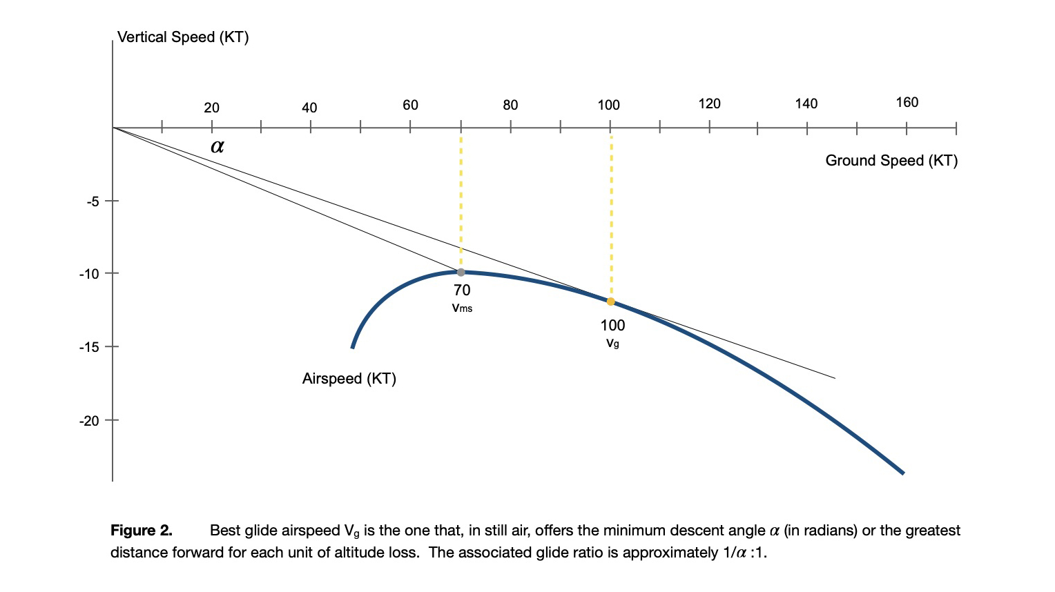 If surrounding terrain is inhospitable, then the pilot should accept a higher descent rate and use VG instead to reach a more favorable area. If we connect the origin to a point on the graph above, the descent angle γ (in radians) is the angle between this line segment and the horizontal axis. The associated glide ratio is 1/γ :1. For example, gliding at VMS = 70 knots, the aircraft descent rate is 10 knots for a glide ratio of 70:10 or 7:1. But if we form the line segment from the origin that barely touches the graph, the tangent line, the glide ratio improves to 100:12 or 8.33:1. The airspeed corresponding to this point of tangency is VG, best glide airspeed.