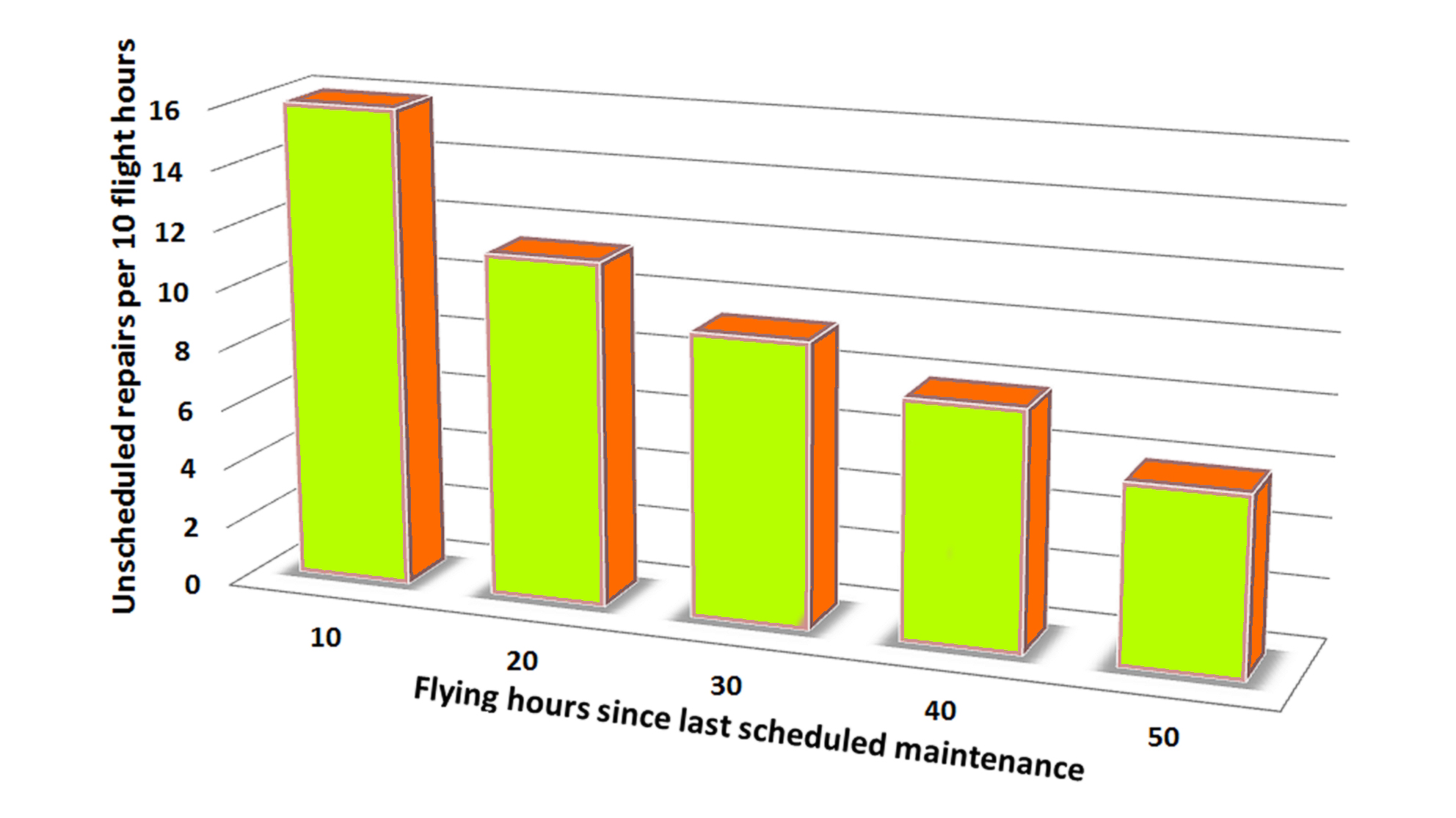 Waddington and his team started gathering data about the scheduled and unscheduled maintenance of these aircraft. When they plotted the number of unscheduled aircraft repairs as a function of flight time, they discovered something unexpected: Whenever these aircraft came out of 50-hour maintenance, the number of mechanical squawks increased sharply, then declined steadily over time until the next 50-hour maintenance, at which time they spiked again. This phenomenon became known as “the Waddington effect” and resulted in a recommendation to the RAF that the 50-hour maintenance interval be increased and the amount of scheduled maintenance be decreased. When these recommendations were implemented, the number of effective flying hours of the British Coastal Command bomber fleet increased by more than 60 percent.